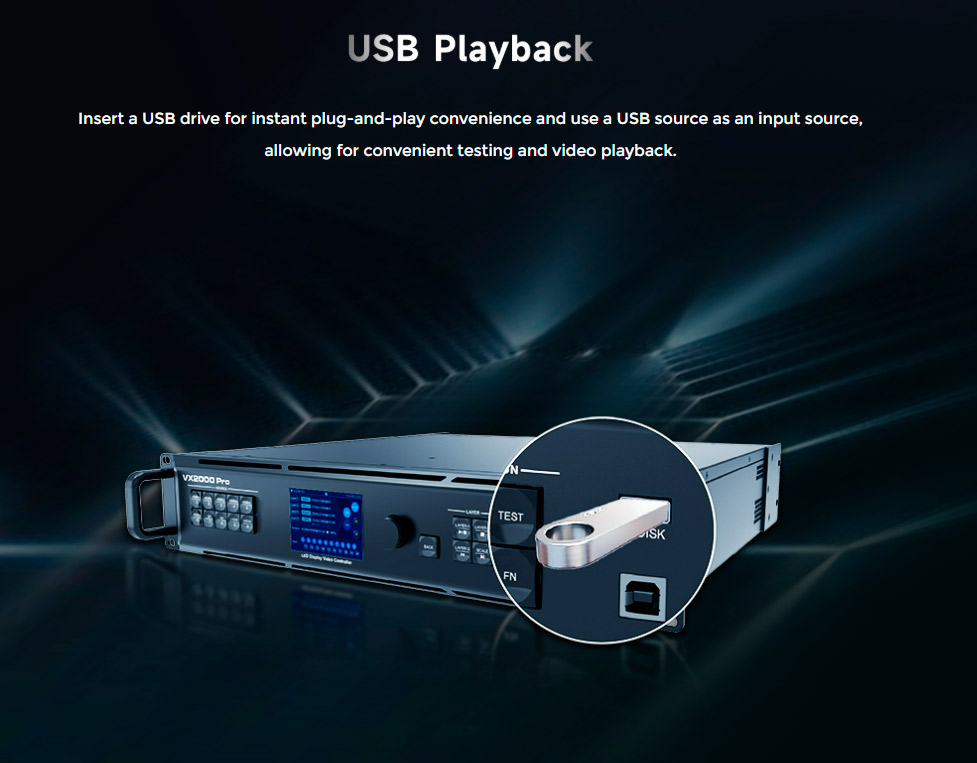 • O VX2000 Pro está alojado em uma caixa de nível industrial, que, combinada com seus poderosos recursos de processamento e transmissão de vídeo, o torna robusto e adequado para ambientes operacionais complexos. O VX2000 Pro é perfeito para aluguel de médio e alto padrão, sistemas de controle de palco e telas de LED de passo fino.