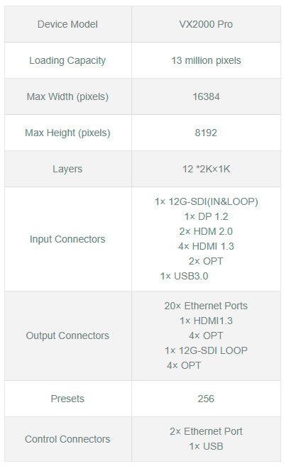 Capaz de gerenciar até 13 milhões de pixels, o VX2000 Pro pode produzir com uma largura máxima de 16.384 pixels e uma altura de 8.192 pixels, tornando-o perfeitamente adequado para controlar telas de LED ultra-largas e ultra-altas no local.